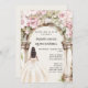 Um grande arco de mármore decorado com flores cor-de-rosa. Uma garota com um vestido branco.