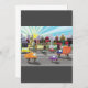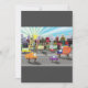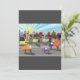 Uma paisagem urbana com tráfego em uma estrada em primeiro plano. Esta design parece realmente eficaz neste Convite