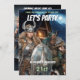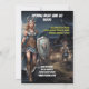 Dois guerreiros viking bárbaros vestindo capacetes corados e couro com pelo e calças e topos de metal estão ameaçadoramente diante de vocês. Ela está segurando um escudo metálico em seu peito e tem cabelo louro longo enquanto ele tem uma barba longa. Uma casa-quadro A com luz noturna acesa aparece no fundo contra colinas distantes e lua de cheio. As costas têm uma guerreira nórdica que caminha em sua direção e uma lutadora bárbara na vila. Modelos de texto branco e verde-claro e preto são exibidos frente e verso para sua redação personalizada. Estas são ideais para "viking themed festas de aniversário" e são adequadas tanto a adultos como a crianças, sejam eles homens, mulheres, meninos ou meninas.