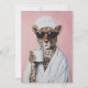 Um leopardo na moda gosta de uma manhã confortável, envolto em um roupão branco com uma toalha na cabeça, bebendo café enquanto veste óculos de sol contra um fundo rosa-chic.