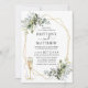 O Cartão de Convite para Casamento de Cores Biológicas Elegantes Modernos inclui folhas de eucalipto, folhagem botânica verde, folhas azuis empoeiradas e outros belos lençóis botânicos. Dourado quadro geométrico. Sage Green Back. Vidro de Champanhe com Fita.