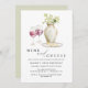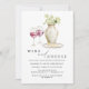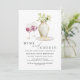 Convites de aniversário para adultos, com tema de vinho, com uma ilustração aquosa de dois copos de vinho tinto, junto a uma placa de cunhas de queijo. Pode ser mudado para qualquer idade. Cena de mesa bonita com os detalhes do evento abaixo. O verso é um verde-claro coordenador.