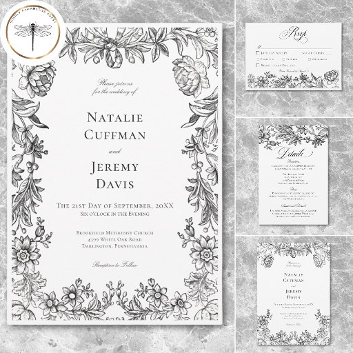 Convite Vintage Black & White Tapeçaria Floral Casamento