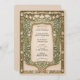 Este belo convite para o casamento de Art Nouveau apresenta uma exuberante estrutura botânica adornada com flores delicadas, vinhas e folhagem dourada, criando uma estética romântica e eterno. Os tons verde-suave e creme, aliados a detalhamento floral intrincado, dão a esta design uma safra, mas elegante, perfeita para casamentos clássicos ou inspirados na natureza. A tipografia refinada combina-se perfeitamente com a estrutura do ornamentado, elevando a sofisticação geral do cartão. O verso do convite mostra um emblema monográfico minimalista com um motif floral estilizado, acrescentando um toque pessoal e artístico. Ideal para casais que buscam um tema de casamento elegante e inspirado em vintage.