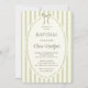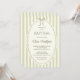 This invitation features a clean, understated design with a soft sage green stripe pattern background that gives it a classic tailored look. A centered oval with a wavy hand drawn border and a bow gives this invitation a vintage look, while the mix of serif, sans serif and script typography adds a touch of elegance without feeling formal. The muted color palette lend a calm, traditional feel, resulting in a style that is refined, minimal and quietly romantic.