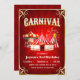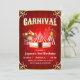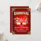 O convite inspira-se na design de safra por ter uma única borda de bronze leve para complementar o fundo do padrão de carnaval vermelho. Cada carnaval, como tenda, carrossel e roda-gigante, é desenhado digitalmente.