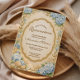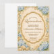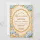 A romantic vintage coastal design featuring soft blue hydrangeas, seashells, nautical rope, and delicate anchors surrounding an elegant ornate frame. The watercolor florals and warm antique parchment background create a timeless seaside aesthetic inspired by classic botanical illustrations and coastal gardens. Perfect for an elegant celebration with a refined ocean-inspired atmosphere.
