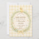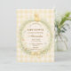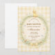 A charming vintage baby shower design featuring a sweet little duckling resting above a delicate floral wreath. Soft watercolor wildflowers and greenery frame the center, finished with a gentle ribbon bow and a warm yellow gingham background that adds a cozy nursery feel. The storybook illustration style and pastel countryside palette create a timeless, cottage-inspired look perfect for celebrating a new baby in a soft and elegant way.