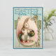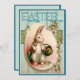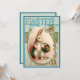 Convide seus amigos e familiares para uma caçada de ovos na Páscoa e brunch com um convite que inclui a reprodução de uma ilustração de Páscoa antiga com um desenho antigo de um coelho segurando uma cesta de vegetais numa mão e um guarda-chuva na outra. O coelho da Páscoa está rodeado por uma forma de ovo cor-de-rosa com flores brancas que se sobrepõem à sua borda. O fundo é constituído por lascas de madeira azul-esverdeadas, pálidas, com a palavra "Páscoa" impressa no topo. A imagem pintada tem uma fina borda branca cercada por uma borda azul mais larga como se tivesse um fosso. Personalize os detalhes do evento na parte traseira da placa na barra lateral. Para ver a Ilustração do Coelho da Páscoa da Vintage em outros itens, clique no link "Artes da Floresta" abaixo.