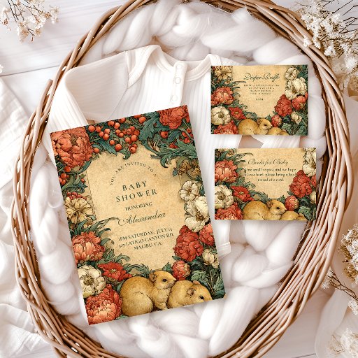 This baby shower design features an enchanting vintage floral frame filled with lush blossoms, soft greenery, and sweet baby animals, illustrated in a timeless storybook style. Warm parchment tones paired with rich reds and greens create a cozy, old-world botanical aesthetic that feels both charming and elegant.