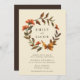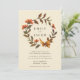 Convide convidados para o seu casamento com nossos convites de casamento Vintage Floral Wreath! Os convites únicos mostram seus nomes cercados por uma coroa de óleo pintada de flores laranja vermelhas, folhas verdes e marrons, borboletas e insetos de senhora. O convite para o casamento floral da vintage reverte para um fundo castanho escuro sólido.