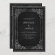This elegant wedding invitation features an ornate vintage silver frame on a distressed off-black background in imitation of an antique book cover. Customize the silver gray text with your names and wedding details. The reverse side repeats the frame motif and provides space for wedding details, along with a QR code guests can scan to visit your website and RSVP, which saves the cost of printing and mailing separate RSVP cards.