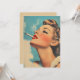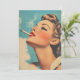 Um poster vintage impressionante ao estilo dos anos 50, que apresenta uma mulher glamourosa com lábios vermelhos ousados e maquiagem sem falhas, fumando sensualmente um cigarro. A fumaça suave coça-se à sua volta, contra um fundo azul sonhador que captura o fascínio e a elegância da publicidade retrô.