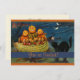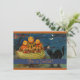 Halloween Pumpkins Jack-O-Lantern Black Cat - Esta ilustração antiga de um gato preto e abóboras de halloween fazem um presente assustador de Halloween. A imagem veio de um antigo cartão postal do Dia das Bruxas. Esta placa de Halloween assustadora apresenta três abóboras engraçadas de jack-o-lanterna. As abóboras esculpidas estão sentadas numa grande melancia, numa noite de Halloween com um gato preto. Há uma lua crescente no fundo, estabelecendo o clima para uma festa assustadora de Halloween. O gato preto aparece enquanto vê as abóboras.