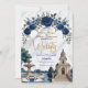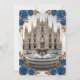 Transport your guests to Italy with this luxurious design featuring the Milan Cathedral, navy roses, and swans. Perfect for sophisticated destination weddings.This design features a romantic watercolor illustration of the Duomo di Milano (Milan Cathedral) centered behind a grand fountain featuring two white swans in a heart-shaped embrace. The architecture is framed by an ornate arch of deep navy blue roses and printed faux gold leaves, set against a classic white marble texture background. The typography utilizes an elegant faux gold foil script for the couple's names, simulating a luxury metallic shine.This is a flat printed image with a printed faux foil and marble effect, not actual raised foil or stone material.