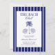 A modern yet retro-inspired beach bachelorette weekend invitation featuring navy blue and white stripes for a crisp, nautical feel. The main heading reads “The Bach Club” in a striking blend of modern sans-serif and vintage script typography, balancing minimalist clarity with classic elegance. At the center, a hand-drawn palm tree illustration anchors the design, flanked by two clam sea shells on each side—adding a touch of old money coastal charm and luxury seaside vibes. The layout includes a weekend itinerary section, carefully styled to feel both sophisticated and playful, making it easy for guests to follow along. The overall aesthetic blends classic luxury with minimalist design, evoking a timeless yet fresh look that feels perfect for a chic beach celebration.