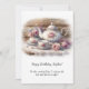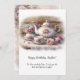 This image is a soft, romantic watercolor-style illustration of a vintage tea setting arranged on a lace-covered wooden table. A delicate porcelain teapot, teacup, and matching saucer are decorated with blush pink roses and subtle floral details. Beside the teapot sits a small floral vase filled with pastel roses and airy blossoms, while additional pink roses and greenery rest gently on the table. The background features warm, weathered wood planks that add rustic charm, and the entire scene is framed by a gentle white vignette that softly fades the edges. The color palette is muted and elegant—creams, blush pinks, soft greens, and pale blues—creating a peaceful, shabby-chic atmosphere that feels cozy, timeless, and inviting. Personalize the front with recipients name and add a special message - the back gets another special message.