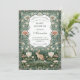 This baby shower design features a classic woodland illustration with a gentle bunny nestled among lush florals and greenery, inspired by vintage botanical and storybook art. The deep green palette, ornate floral border, and soft antique details create a timeless, cozy aesthetic with an old-world charm.