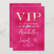 Este convite de festa personalizado apresenta um design VIP glamouroso em um fundo cor-de-rosa quente. O título VIP é impresso em uma fonte estilo folha de ouro, seguido pelo título do evento. Uma faixa de diamantes separa o texto. O local e horário da festa ou evento são impressos no verso. É perfeito para uma festa de aniversário, sweet 16, chá de noiva ou outra celebração elegante.