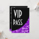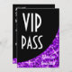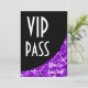Convite com um design moderno com estrelas espalhadas por uma forma estilizada de "aparência de sequin" curvada em tons de roxo colocados sobre um fundo preto com 'VIP Pass you are known' escrito em branco. Pode ser usado como um fundo para seu próprio texto, imagens e ideias. O texto pode ser facilmente alterado usando o modelo fornecido ou clique no botão 'Personalizar' para fazer outras alterações. Observe que esta é uma imagem de arte digital impressa, ela não brilha ou contém falhas reais ou sequências.