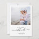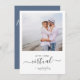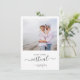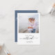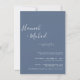 Design russo minimalista apresenta um roteiro moderno, folha floral botânica com foto e cor azul empoeirada no verso do cartão. Personalize facilmente as suas informações de escolha. Ideal convite simples para um casamento virtual online.