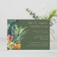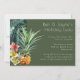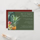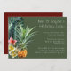 Convite de festas de Natal tropical para festas de férias ou comemoração de casa. Folhas grandes, abacaxi e flores de plumeria decoram cartões verdes planos com dois locais para texto personalizado. O título da festa no topo pode incluir o nome da empresa, ou nomes pessoais, como "Festa de Natal de Joe e Lisas". Também poderia dizer "festa de Luau" quando não usado nos feriados. Todo o texto se alinha corretamente e está na letra fina impressa. Verde é o esquema de cores geral com flores rosa, amarelas e brancas. O reverso é vinho sólido tinto.