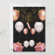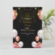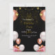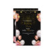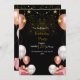 Este convite de aniversário tem um design luxuoso e festivo, perfeito para uma celebração noturna. O fundo preto escuro cria um contraste dramático com os sotaques ouro rosa, branco e rosa. Os elementos decorativos incluem: