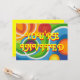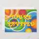Groovy Baby! Convite com um fundo de padrão de arco-íris psicodélico giratório e texto amarelo. Um design personalizável amarelo, laranja, vermelho, azul, verde, rosa, roxo e branco para você personalizar com seu próprio texto, imagens e ideias. A partir de um desenho original a lápis colorido digitalmente aprimorado por Jess Perry.