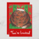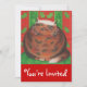 Um gato feliz de tortoisinferno (parecido com um pudim de natal!) senta-se em uma almofada verde contra um fundo vermelho e verde com padrão de folha oca. Convite com um design personalizável vermelho, verde e branco para você personalizar com seu próprio texto, imagens e ideias. Um lápis original colorido de Jess Perry.