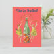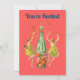 Você é Convidado com duas mulheres dançando em volta de uma garrafa de vidro com flores e laranjas. Design com um toque. Captura a alegria de celebrar um evento. Mensagens ou informações personalizáveis na frente e no verso. Mude para o que quiser.