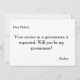 Este belo momento de 5" x 7" para o seu serviço é solicitado como o melhor cartão de convite para o Padrinho de casamento. Isto é melhor para o noivo. Encontrou sua esposa, mas ainda precisa de seus filhos. Envie-lhes este cartão de padrinhos de casamento. Se você está perguntando a alguém para ser sua padrinho de casamento para seu futuro casamento, então por que não escolher esses cartões de padrinho de casamento. Este cartão de convite personalizado fará com que seu amigo, irmão, primo, sobrinho, filho ou qualquer outro que você escolher sinta isso especial. Este convite é facilmente personalizado clicando no botão Personalizar sob a imagem onde você poderá alterar o texto, a fonte e o tamanho. Você pode convidar seus melhores amigos em estilo com estes convites clássicos. É adequado para o Melhor Homem ou para Padrinhos de casamento. Envie-lhes este cartão de padrinhos de casamento.