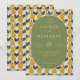 This elegant wedding invitation features a central oval with a muted green background, surrounded by a charming pattern of stylized pears in warm yellow and orange hues on a cream backdrop. The design uses clean lines and flat colors for a modern yet classic feel, enhanced by a sophisticated serif font that adds formality to the layout. The playful pear illustrations create a cohesive theme while maintaining an inviting atmosphere, perfect for celebrating a special occasion like a wedding. The customizable text allows for personalization, making it ideal for couples looking to add their unique touch to their big day.
