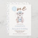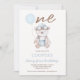 Cute bear themed first birthday invitation for a baby boy featuring a sitting teddy bear wearing flying goggles, overalls and holding a balloon. This beary first birthday invitation also features some non editable modern calligraphy letters.