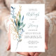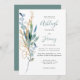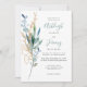 The left-hand edge of this romantic wedding invitation features a bouquet of eucalyptus greenery in blue-green watercolor and gold faux glitter outlines. The customizable text combines handwriting, copperplate and italic fonts in blue-green and charcoal gray on a white background. The reverse side is a matching shade of solid blue-green.