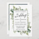 Caligrafia moderna Aquarela O convite para o casamento vegetativo inclui belos verdes botânicos e folhas de eucalipto. Foto de volta