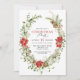Bonito convites de festas de Natal com seus detalhes de evento em um quadro botânico. Plantas verdes de eucalipto e poinsettia vermelha dispostas em coroa com uma cor verde macia no verso.