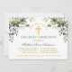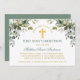 Modern Elegant First Holy Communion Invitation includes watercolor eucalyptus leaves and other beautiful botanical greenery foliage. Sage Green Back. Gold Cross.