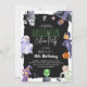 Convite de aniversário bonito e assustador para nasceres infantis em outubro - Este design de Figurino de Halloween apresenta um fundo preto virado para a moda, com personagens engraçados de criança molhadas a água vestidos de rico espetacular. A divertida modelo moderna da festa de aniversário é fácil de personalizar.