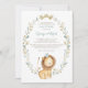 Convide familiares e amigos para o seu evento com este convite bautismo personalizável. Apresenta ilustrações de aquarelas de um bebê preço de leão e coroa de folhagem com padrão correspondente. Personalize adicionando nome, data, hora, local e outros detalhes do evento.