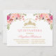 Elegant Watercolor Pink Blush White Floral Mis Quince Anos Quinceanera Invitation includes pink roses and greenery leaves. Pink Back. Calligraphy Script Name. Gold Tiara Crown.
