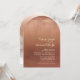 Este convite de casamento moderno, em forma de arco, tem uma sensação quente e pessoal e apresenta um abstrato, design de aquarela, semelhante a reflexões sobre a água. Esse exemplo tem uma paleta de cores gradiente de pêssego pálido a terra escura. Personalize com os nomes da noiva e do noivo, a data do casamento e os detalhes do evento usando o modelo fornecido. Procure ID774 para ver o conjunto de correspondência completo e opções de cor adicionais.