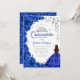 Convite para comemoração da Quinceanera, cor branca prateada azul-real, floral de aquarela. Possui uma morena em vestidos de capa de bola, fonte de script, borboletas prateadas, rosas e tiara. Perfeito para uma elegante celebração de glam estilo princesa. Personalize com seus próprios detalhes. Impressos convites Zazzle ou modelo de impressão digital instantânea para download.