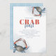 This design features a simple watercolor blue crab feast invitation with a QR code for website, an online URL with a nautical crab boil bake party, a coastal living seaside ocean sea, great for seafood dinner party event invitation, a stylish trendy typography font text, a modern calligraphy script typography, with a Maryland New England Maine coast style, whimsical crab legs boiled baked, an elegant stylish fun water ocean, with a crustacean red blue animal marine, with a blue gingham tablecloth pattern