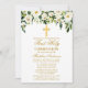 A Elegante Watercolor White Floral First Santa Communion Invitation inclui flores brancas, peões e vegetação botânica. Dourada Cruz.