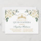 Elegant Watercolor White Floral Mis Quince Anos Quinceanera Invitation includes white roses and greenery leaves. Sage Green Back. Calligraphy Script Name. Gold Tiara Crown.