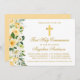 A Elegante Watercolor Amarelo Floral Branco Primeiro Convite à Santa Comunhão inclui rosas amarelas, flores brancas e verde. Dourada Cruz.