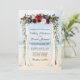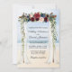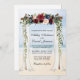 Cartão de Convite Floral para Casamento Elegante Canopy Watercolor Burgundy Marsala inclui belos rosas burgundy, rosas rosa, flores vermelhas e flores azuis. O arco da copa do casamento da madeira inclui vegetação botânica em um fundo oceânico azul-marinho de praia arenosa.