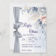Timeless save the date wedding card with soft watercolour florals in dusty blue and blush tones .