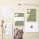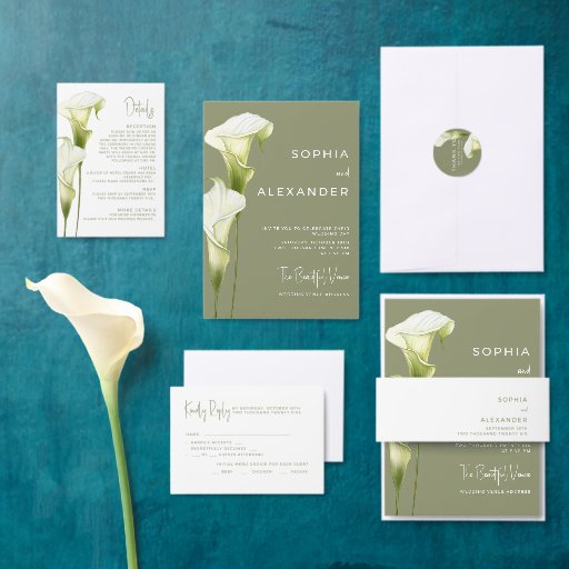 This wedding invitation features a sophisticated, minimalist style. Delicate calla lilies in soft green hues are depicted against a light background, creating an atmosphere of sophistication and tranquility. The design is modern, airy, and perfect for a stylish, romantic wedding.