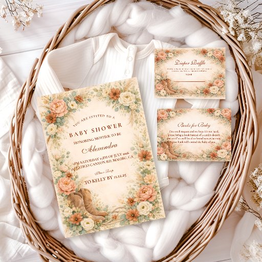 A romantic western baby shower design framed with soft blush and ivory florals, muted sage greenery, and warm terracotta blooms. Delicate pampas accents surround a refined arched layout, while classic cowgirl boots add a subtle rustic statement at the base. The neutral parchment background keeps the look elegant and timeless, blending country charm with modern boho style. Fully customizable for names and event details—perfect for a western, cowgirl, ranch, or desert-inspired celebration.
